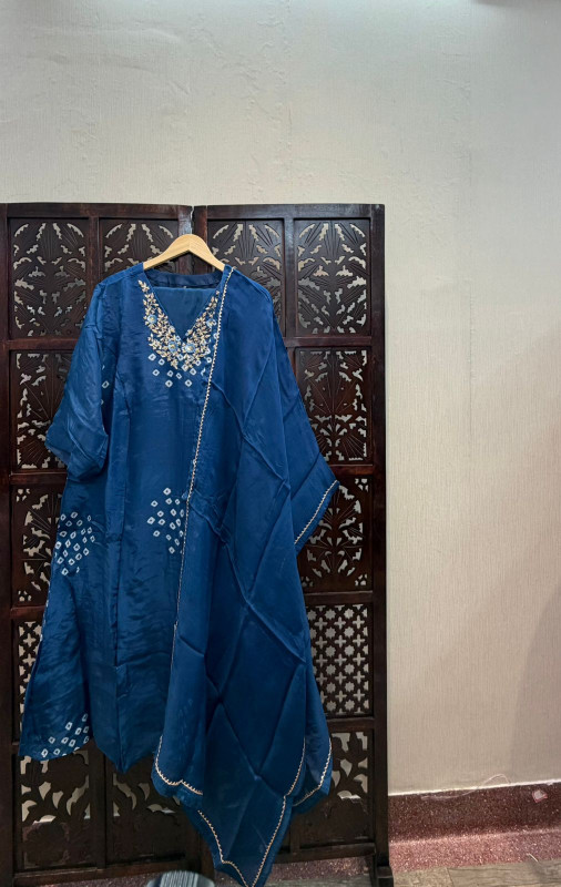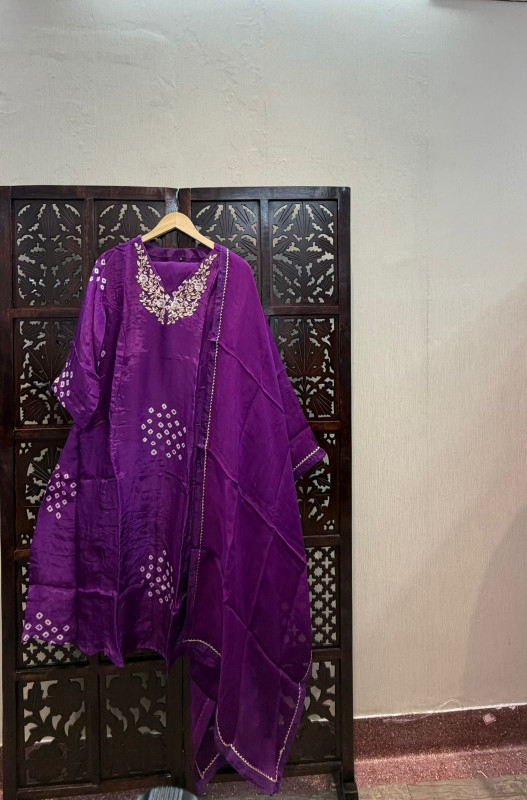 Premium H.O Silk with elegant Bhandhni-style handwork. Rich color, flowy big-size fit, and beautiful neckline detailing make it perfect for festive and classy ethnic wear. Comfortable, graceful, and effortlessly stylish. ✨