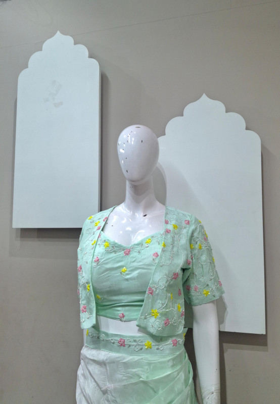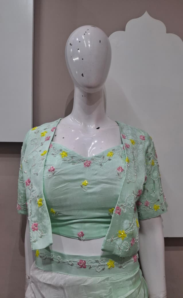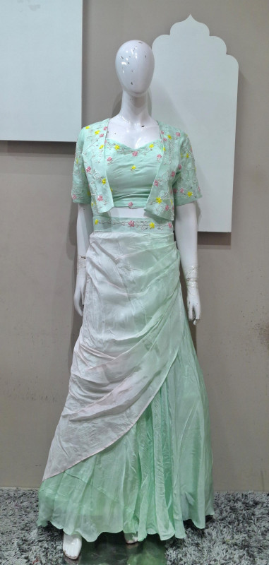 Stylish cowl-style skirt set in premium H.O silk with a chic short jacket and delicate handwork—perfect for carnival and festive vibes.