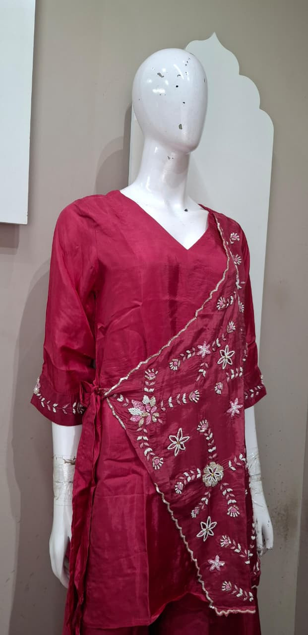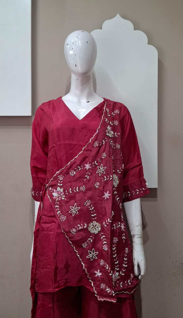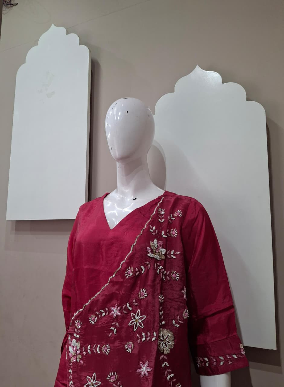 Beautiful suit set in rich tissue fabric featuring elegant handwork with detailed patchwork. A perfect choice for a graceful and festive look.
