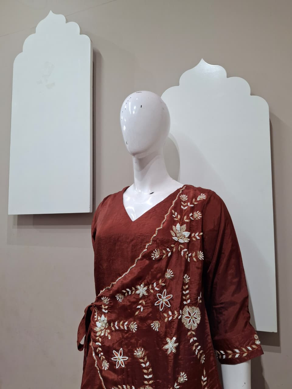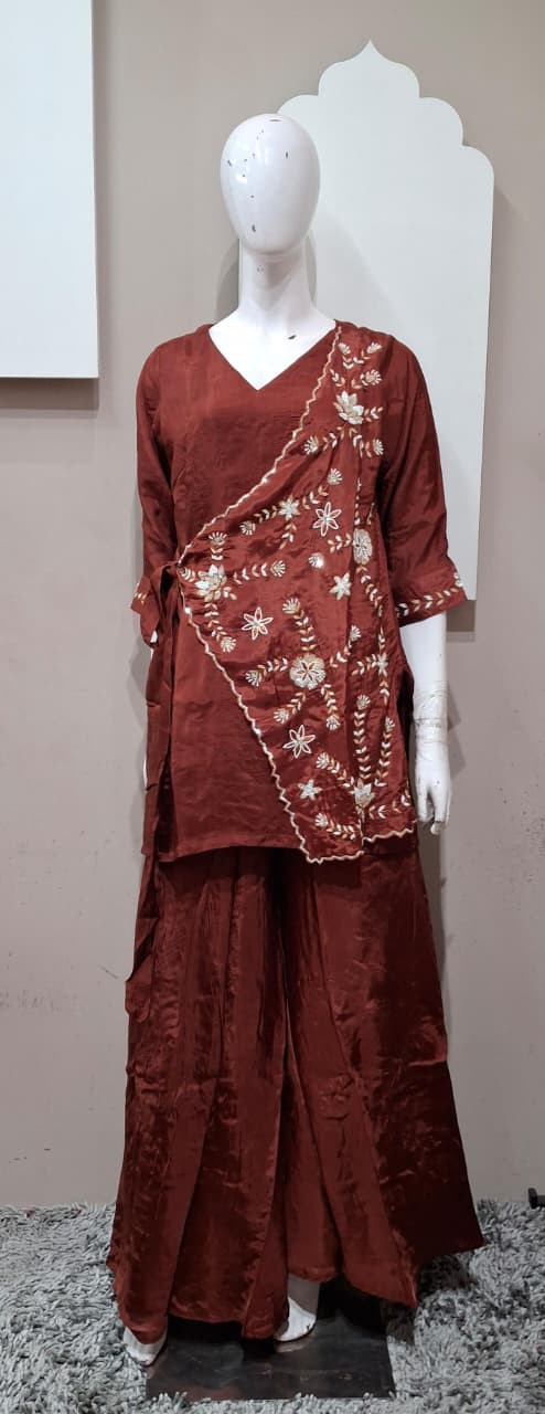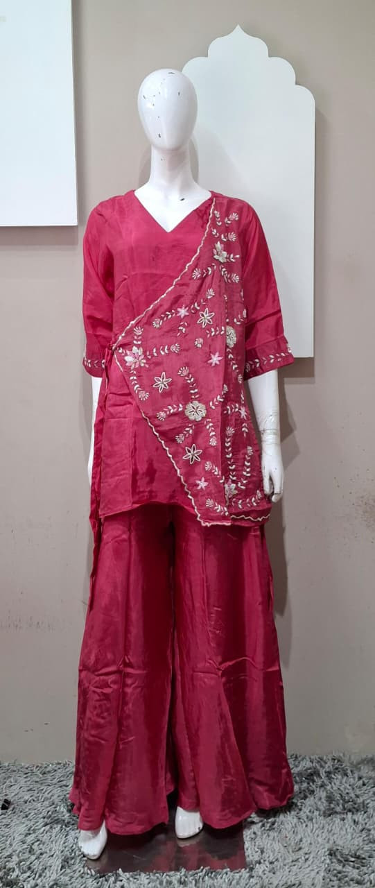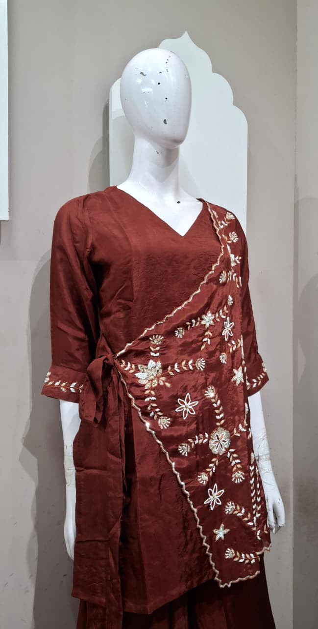 Beautiful suit set in rich tissue fabric featuring elegant handwork with detailed patchwork. A perfect choice for a graceful and festive look.