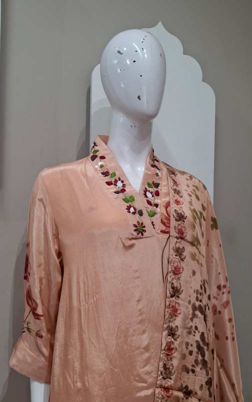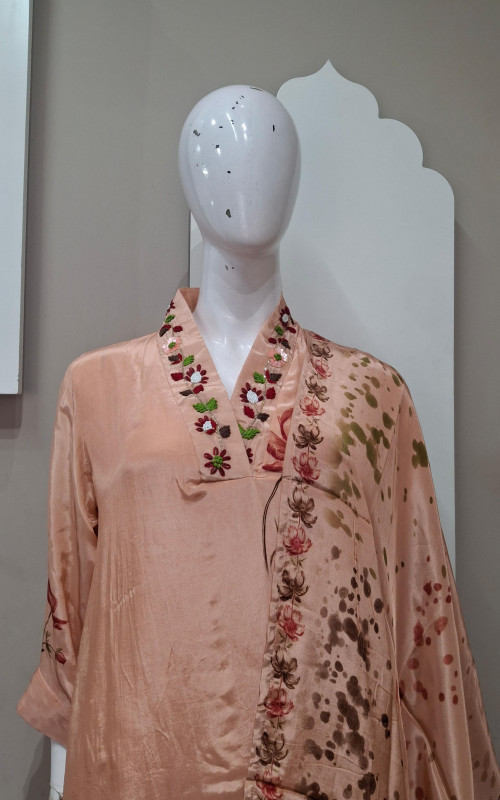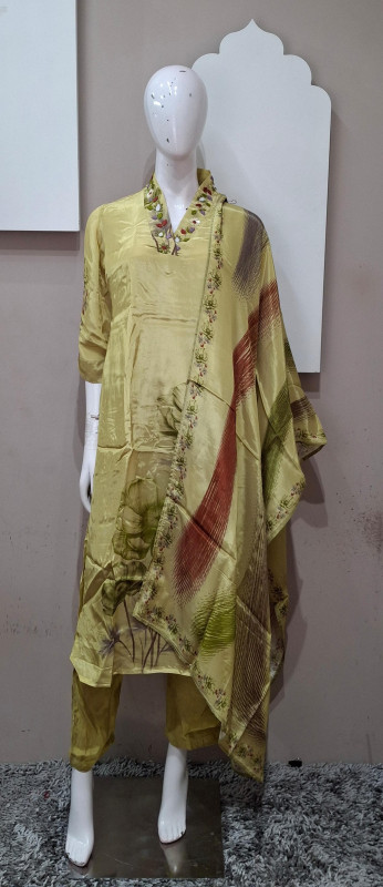 Soft natural crepe fabric kurta with matching pant and dupatta. Features elegant handwork with graceful digital print. Lightweight, comfortable, and perfect for festive occasions, casual functions, and elegant day wear. ✨