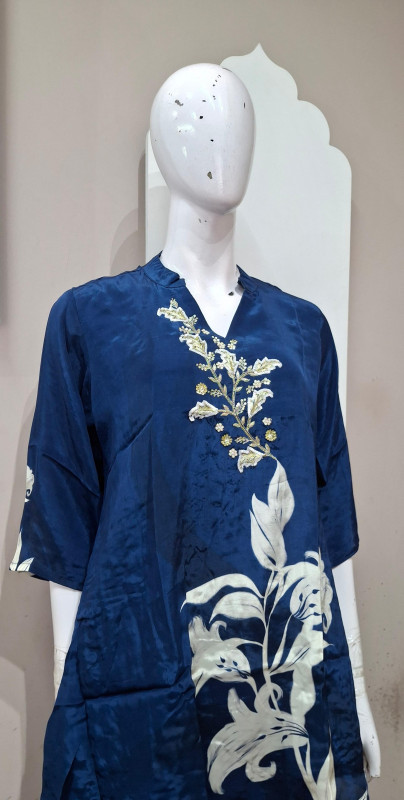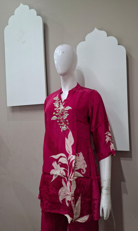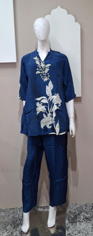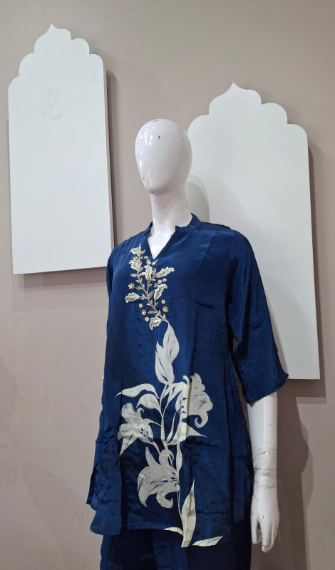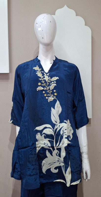 Natural crepe co-ord set with light handwork and digital floral print in blue & rani colors. Easy to wear, comfortable, and perfect for everyday elegance.