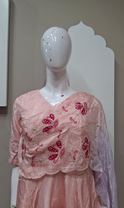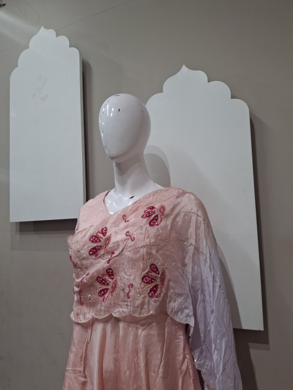 Graceful mulberry-toned gown in premium H.O silk, highlighted with elegant Bandhej patch and delicate handwork—perfect for a soft, festive look.