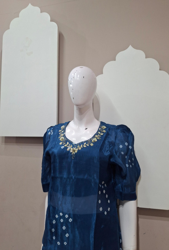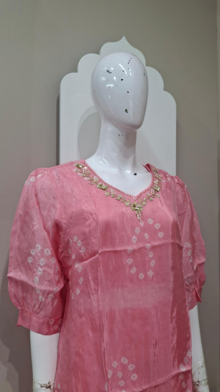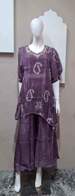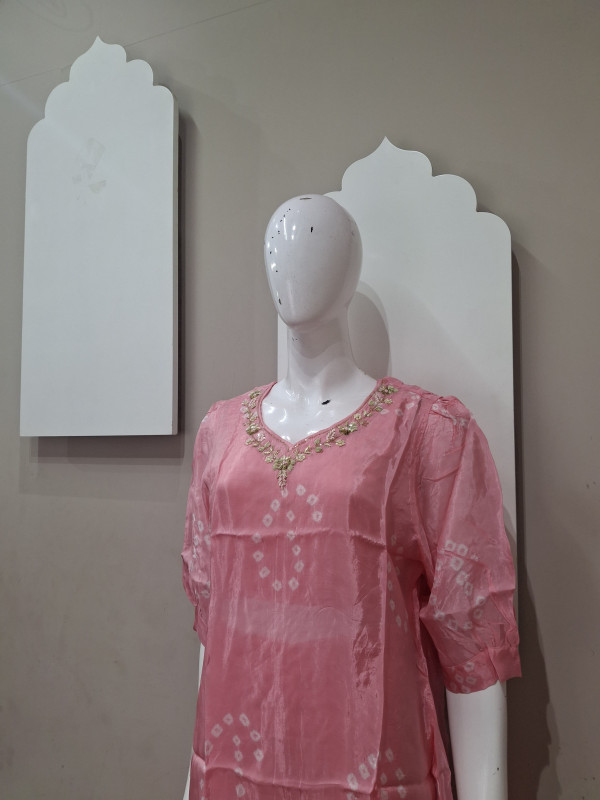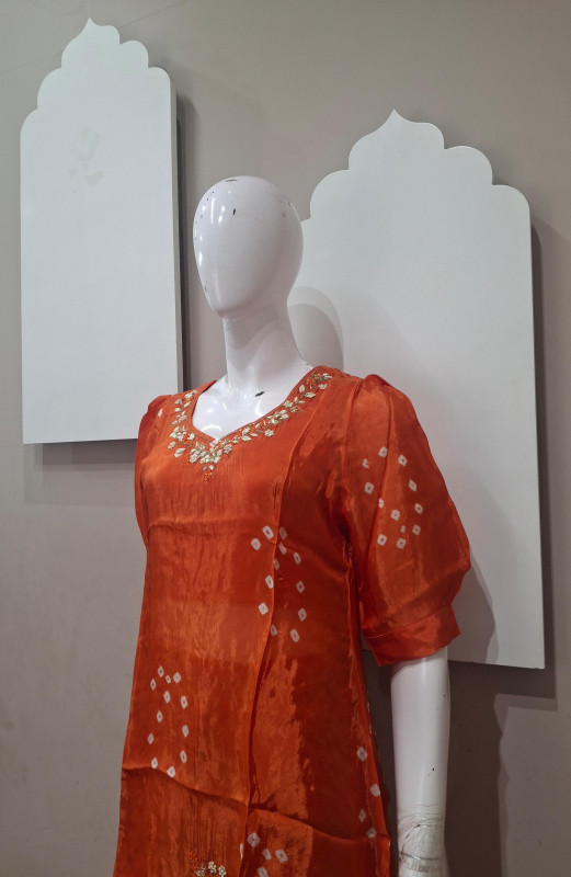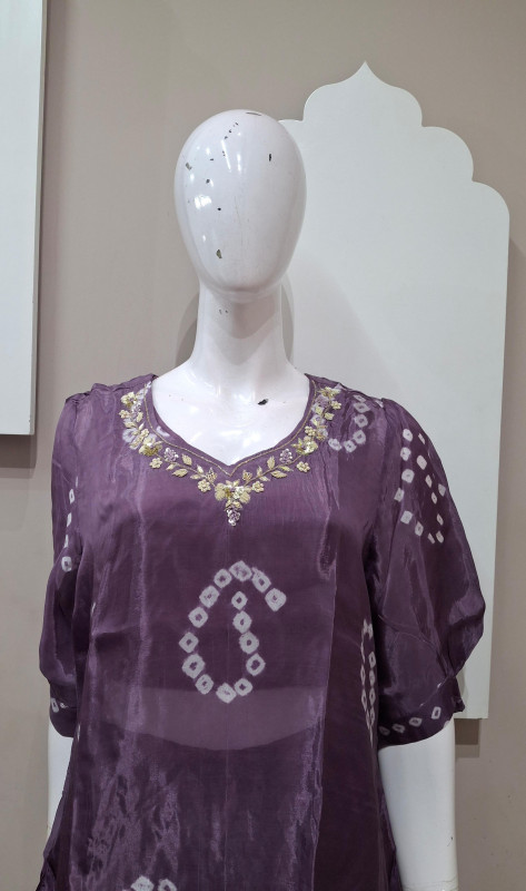 H.O. silk transparent kurta in Bandhani style with traditional handwork, paired with a matching plazo for an elegant look.