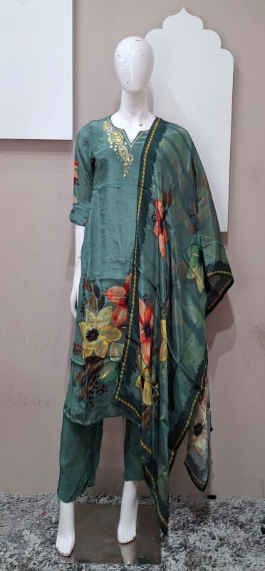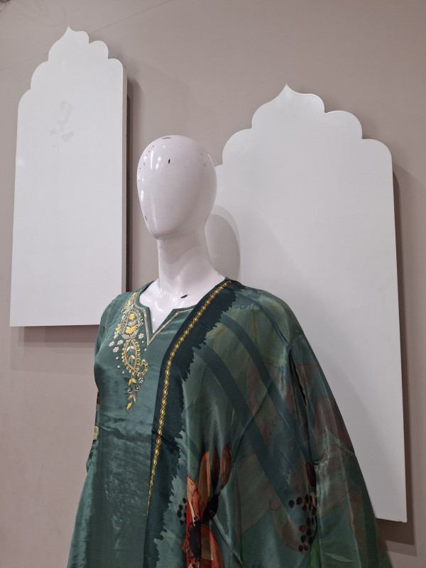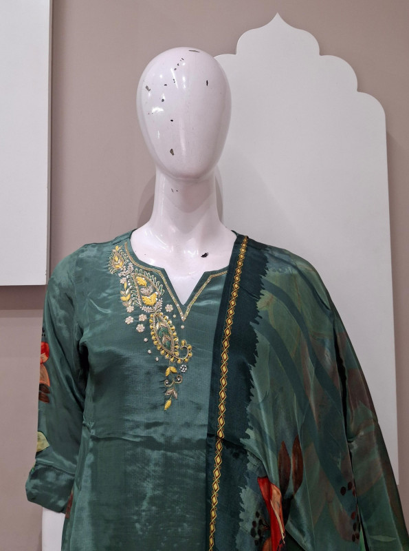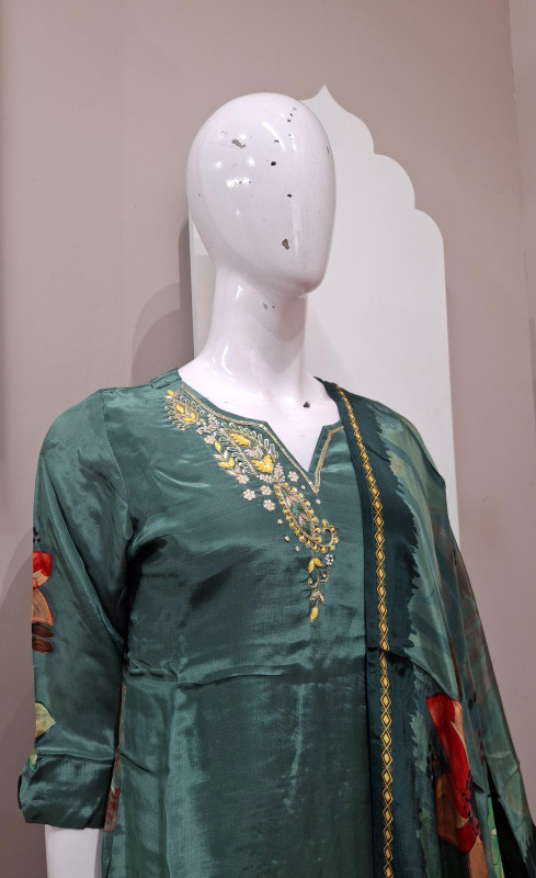 Soft natural crepe fabric kurta with matching pant and dupatta. Features elegant handwork with graceful digital print. Lightweight, comfortable, and perfect for festive occasions, casual functions, and elegant day wear. ✨