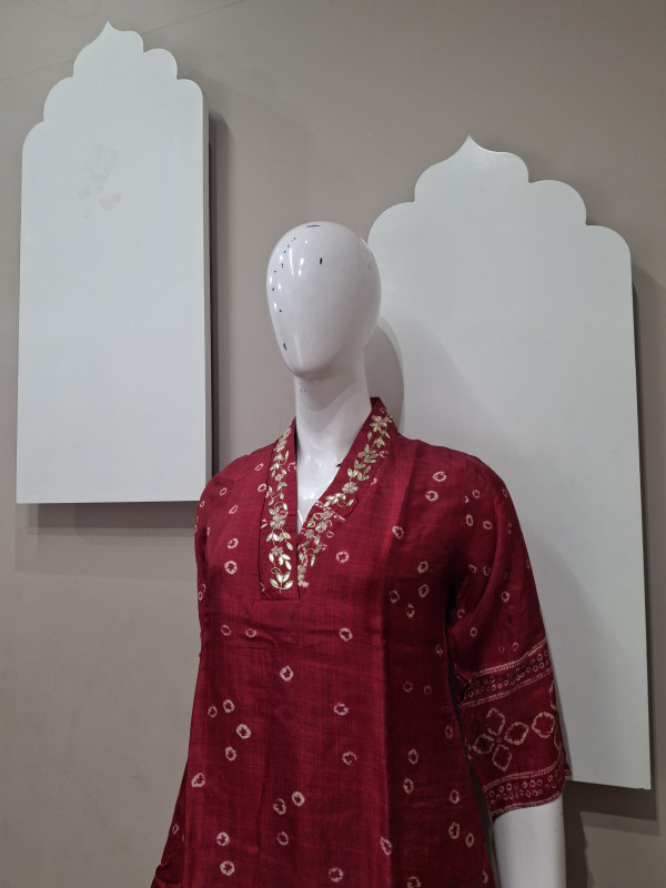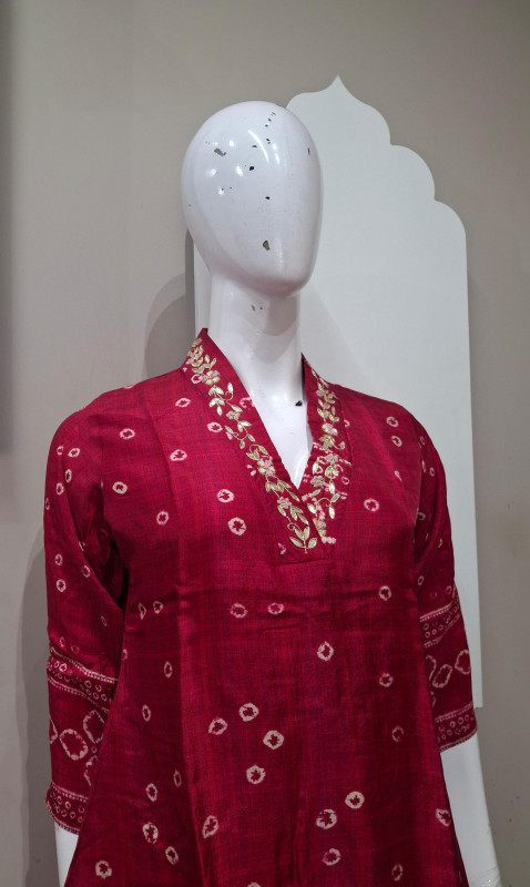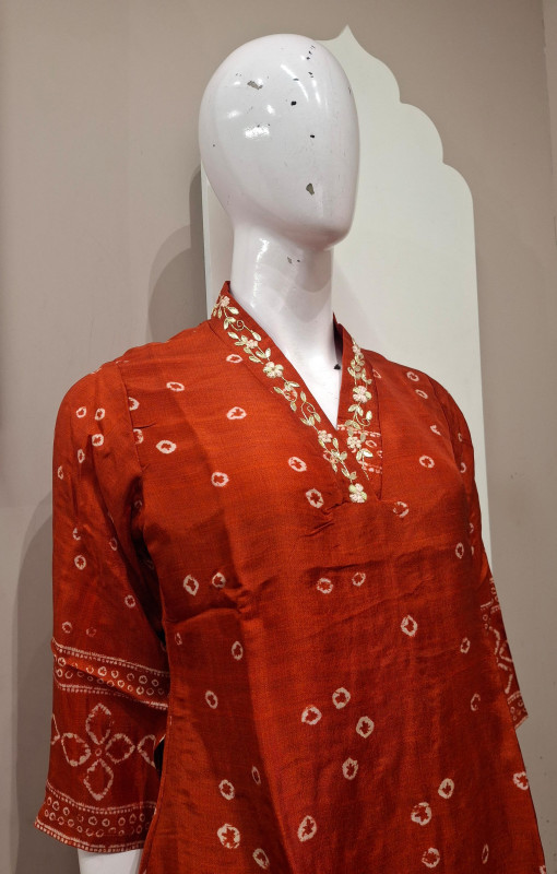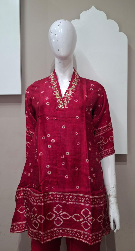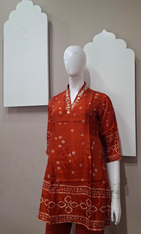 Elegant co-ord set crafted in soft Russian silk fabric, featuring classic Bandhani-style digital print. Designed with a comfortable fit and graceful flow, this set offers a perfect blend of traditional charm and modern style. Ideal for festive wear, casual gatherings, and elegant day outings.