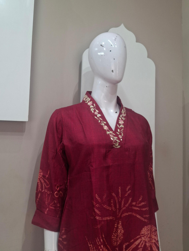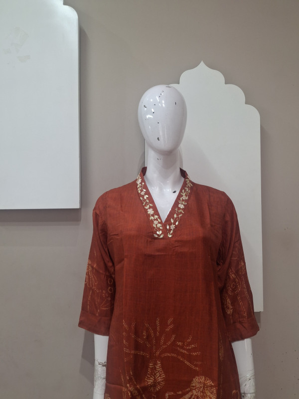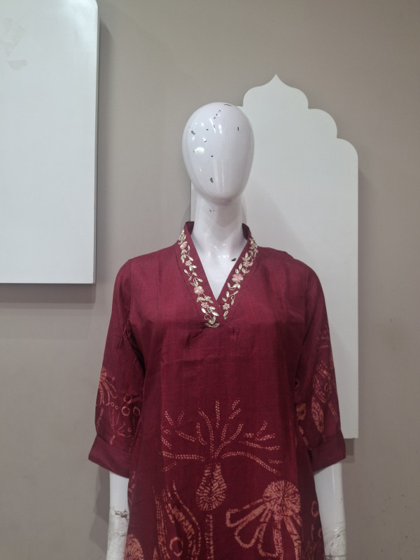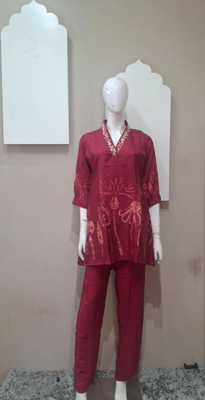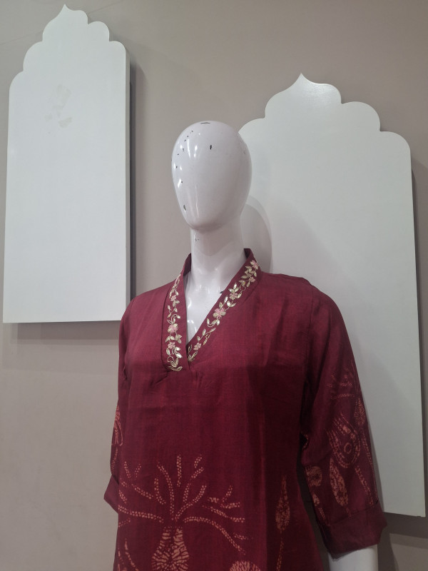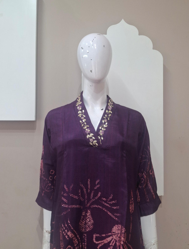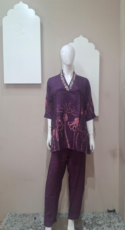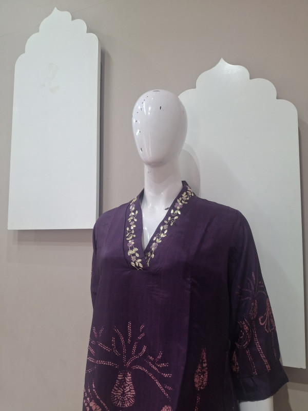 Elegant kurta in premium Ruusain silk featuring subtle digital prints and delicate handwork on the neckline, paired with comfortable santoon pants. Perfect for a graceful and effortless festive look.