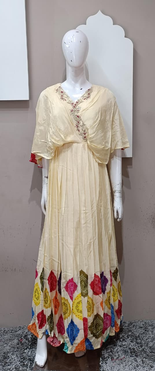 Elegant H.O silk fabric gown with soft floral pattern. Features subtle handwork detailing and a graceful flowy look. Lightweight, comfortable, and perfect for festive occasions, parties, and special gatherings. ✨