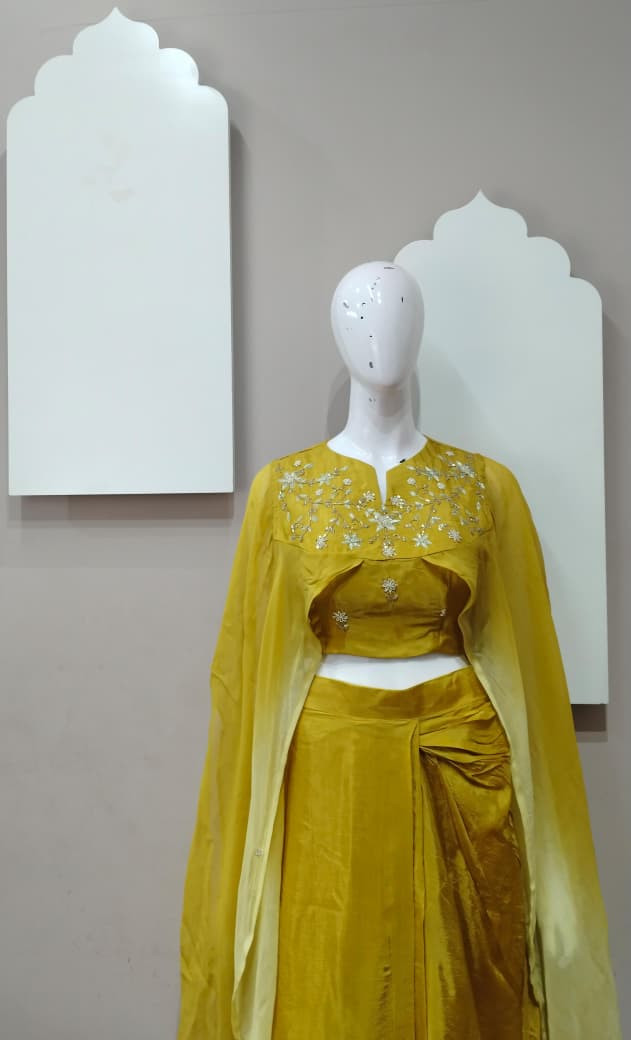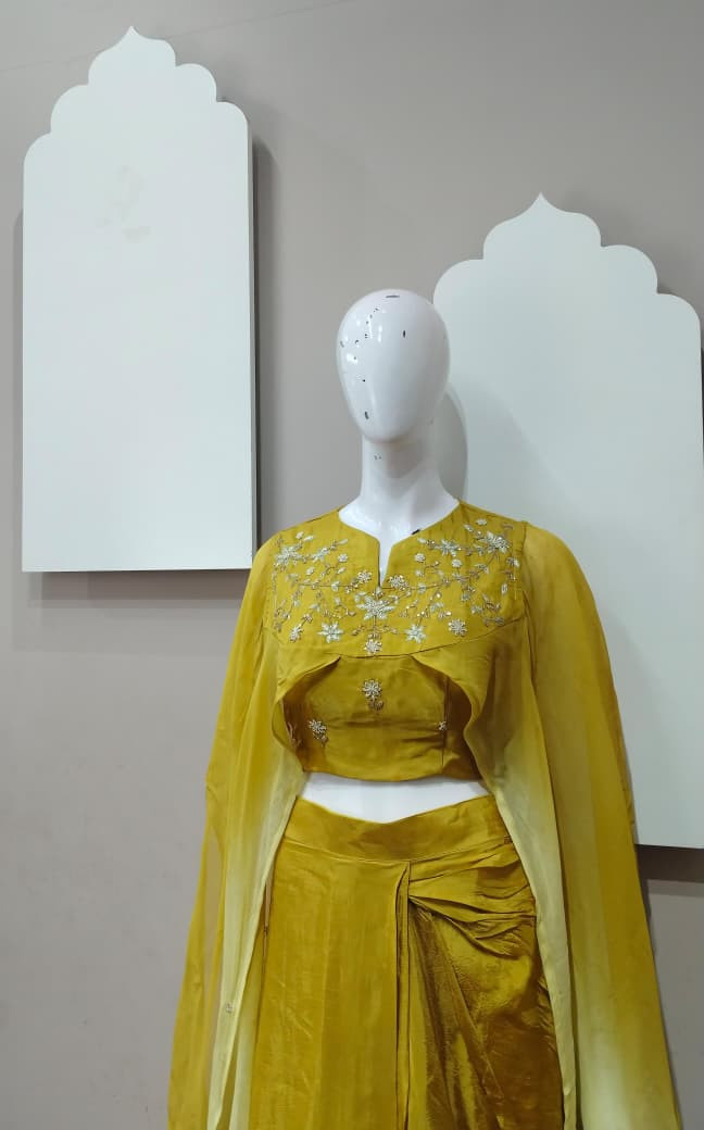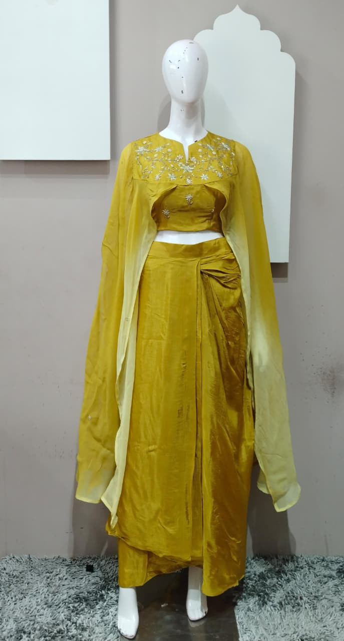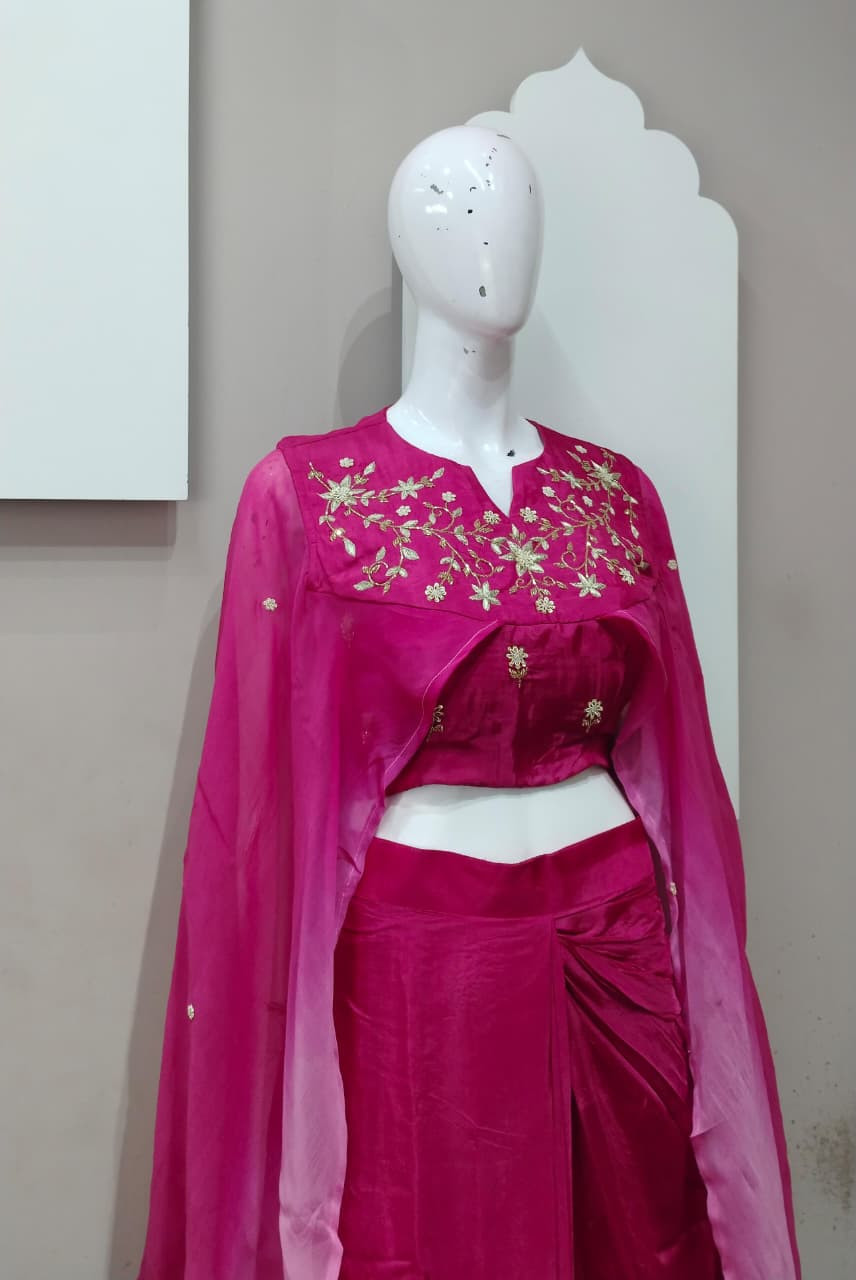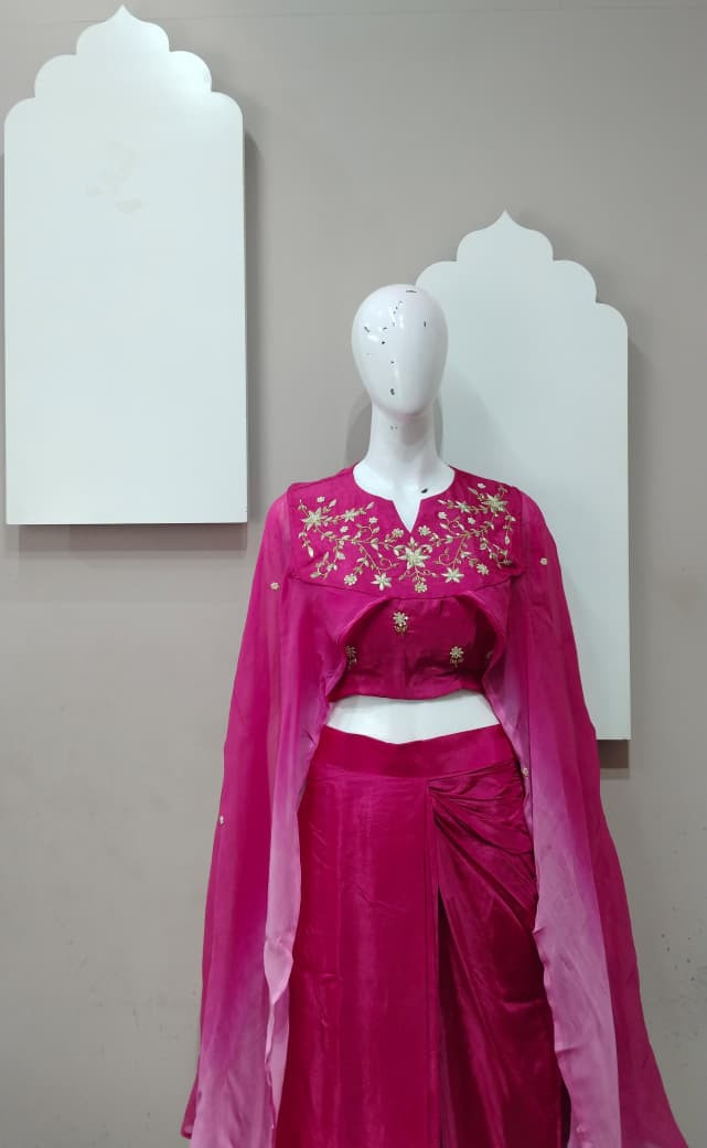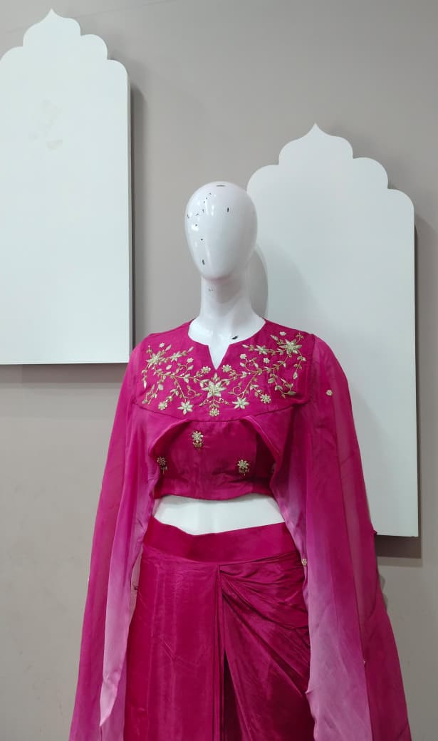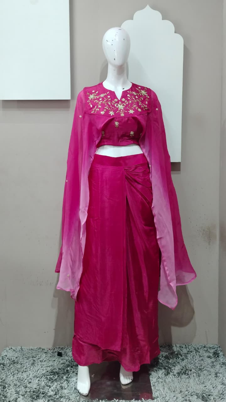 Elegant outfit in rich H.O. silk featuring beautiful handwork on the blouse, paired with a stylish dhoti-style skirt .Perfect for a trendy and festive look.