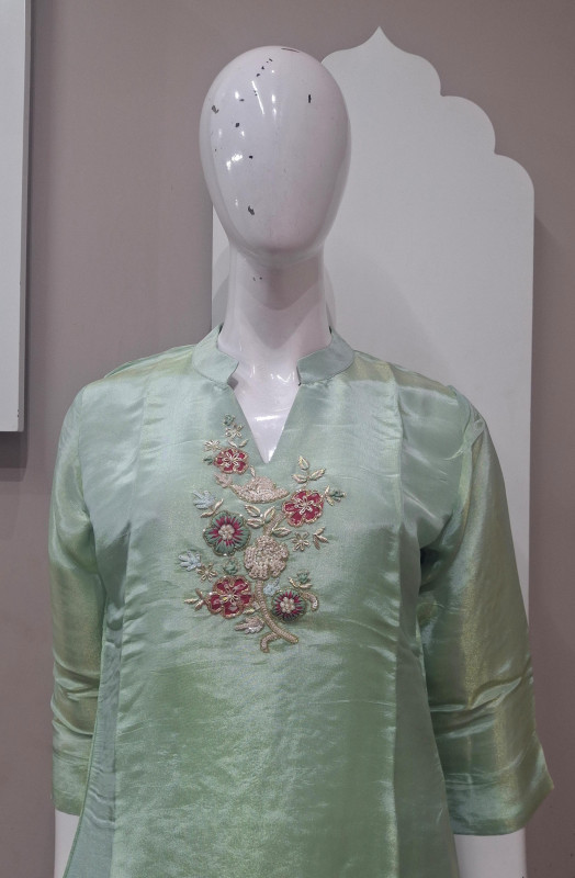 Tissue fabric co-ord set with neat handwork detailing. Light, comfortable, and perfect for everyday wear and small gatherings.