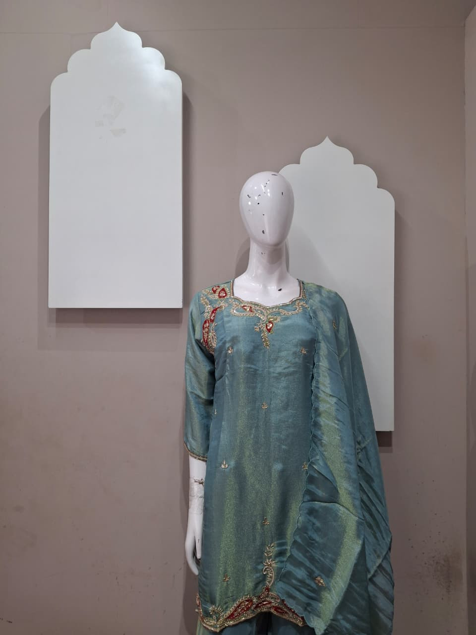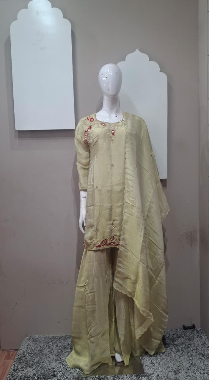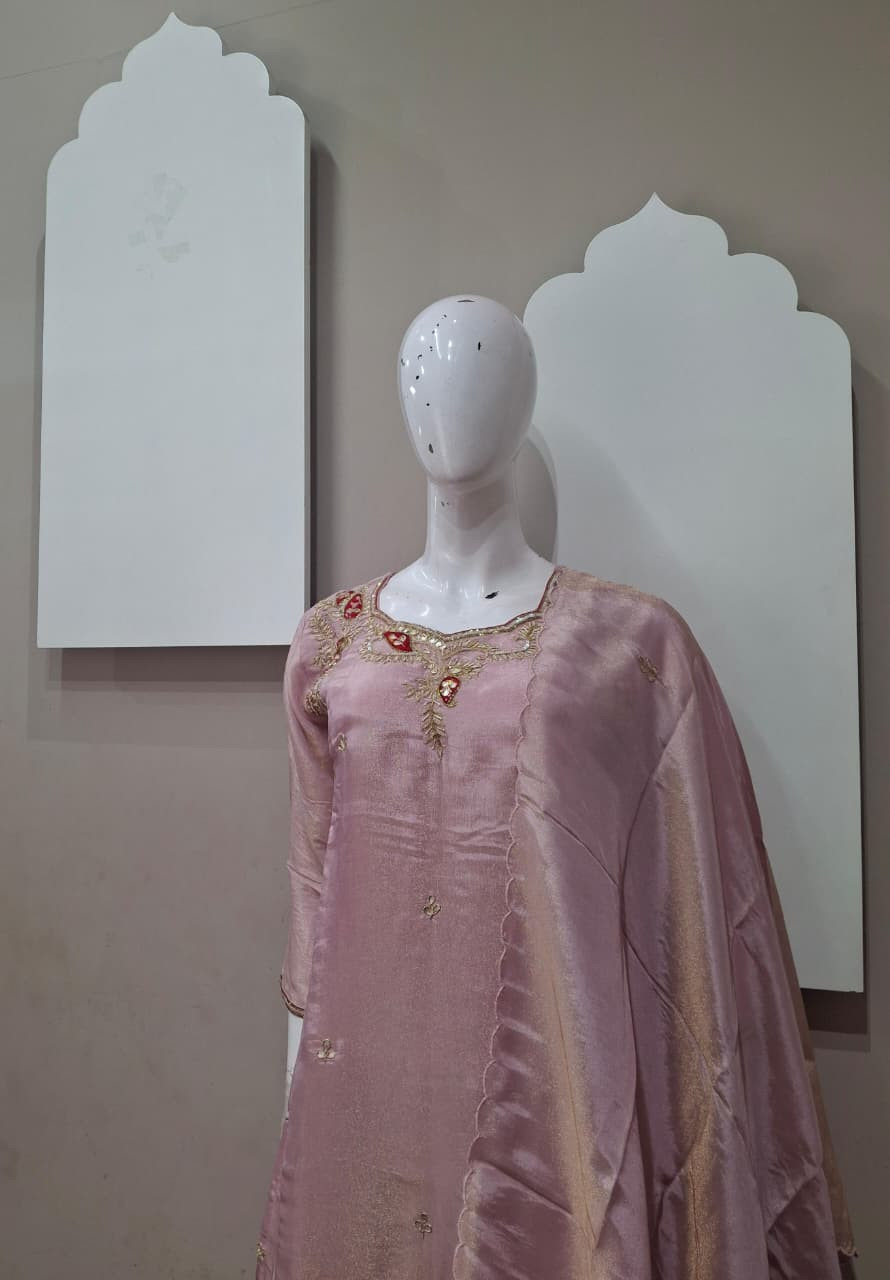 Beautiful suit set in rich tissue fabric featuring elegant handwork with detailed patchwork. A perfect choice for a graceful and festive look.