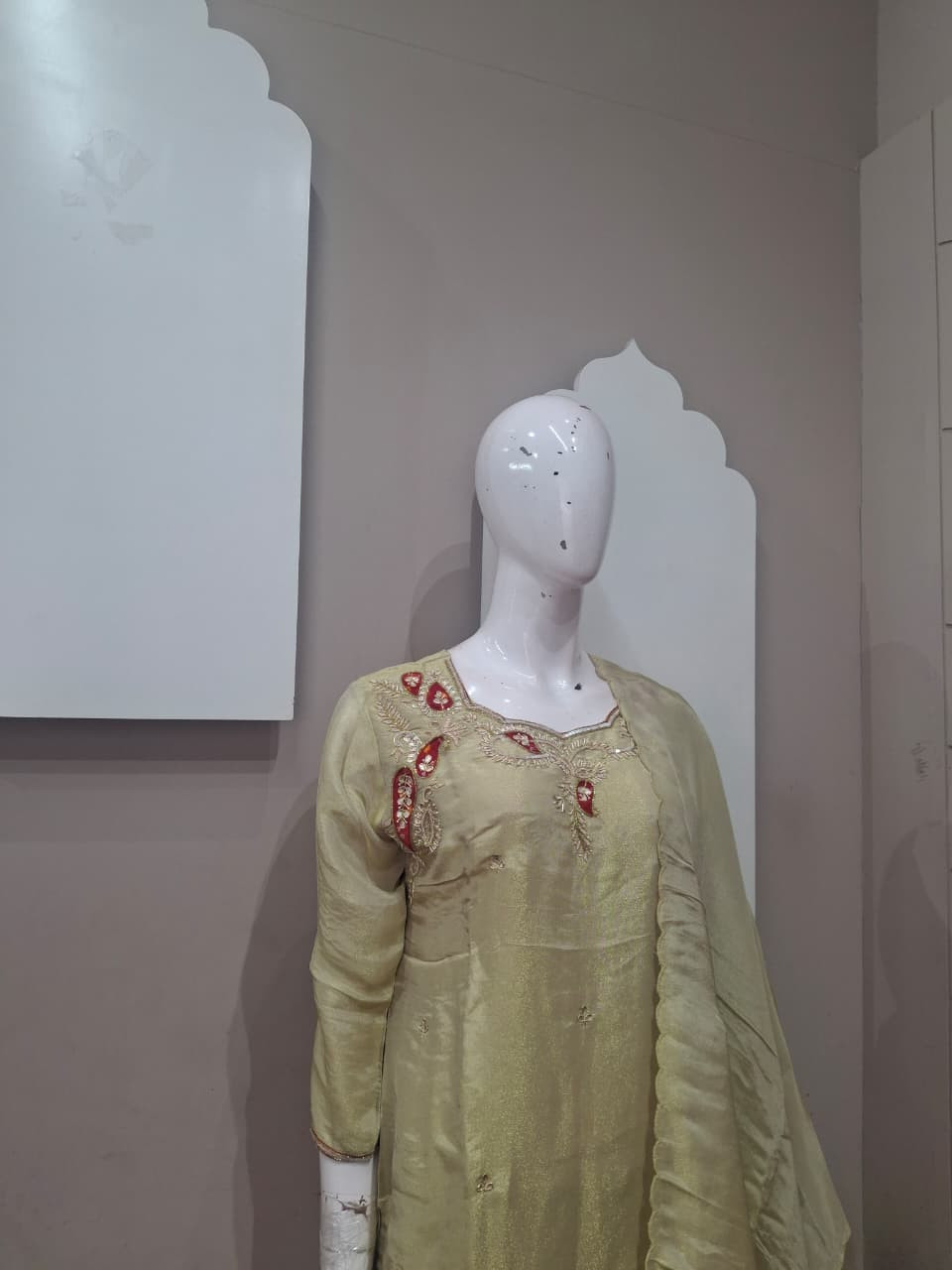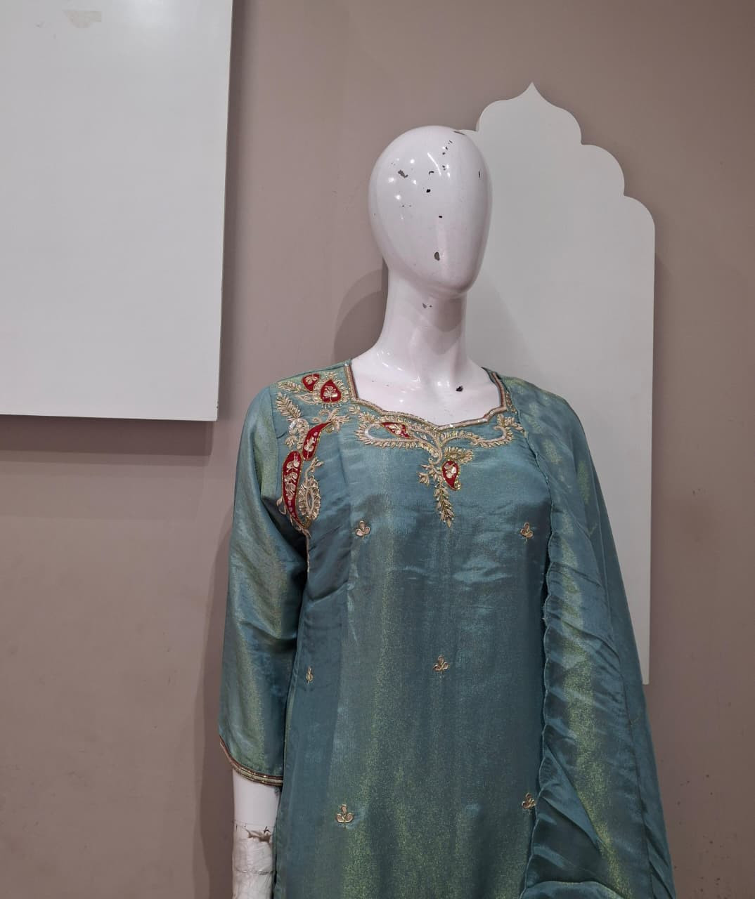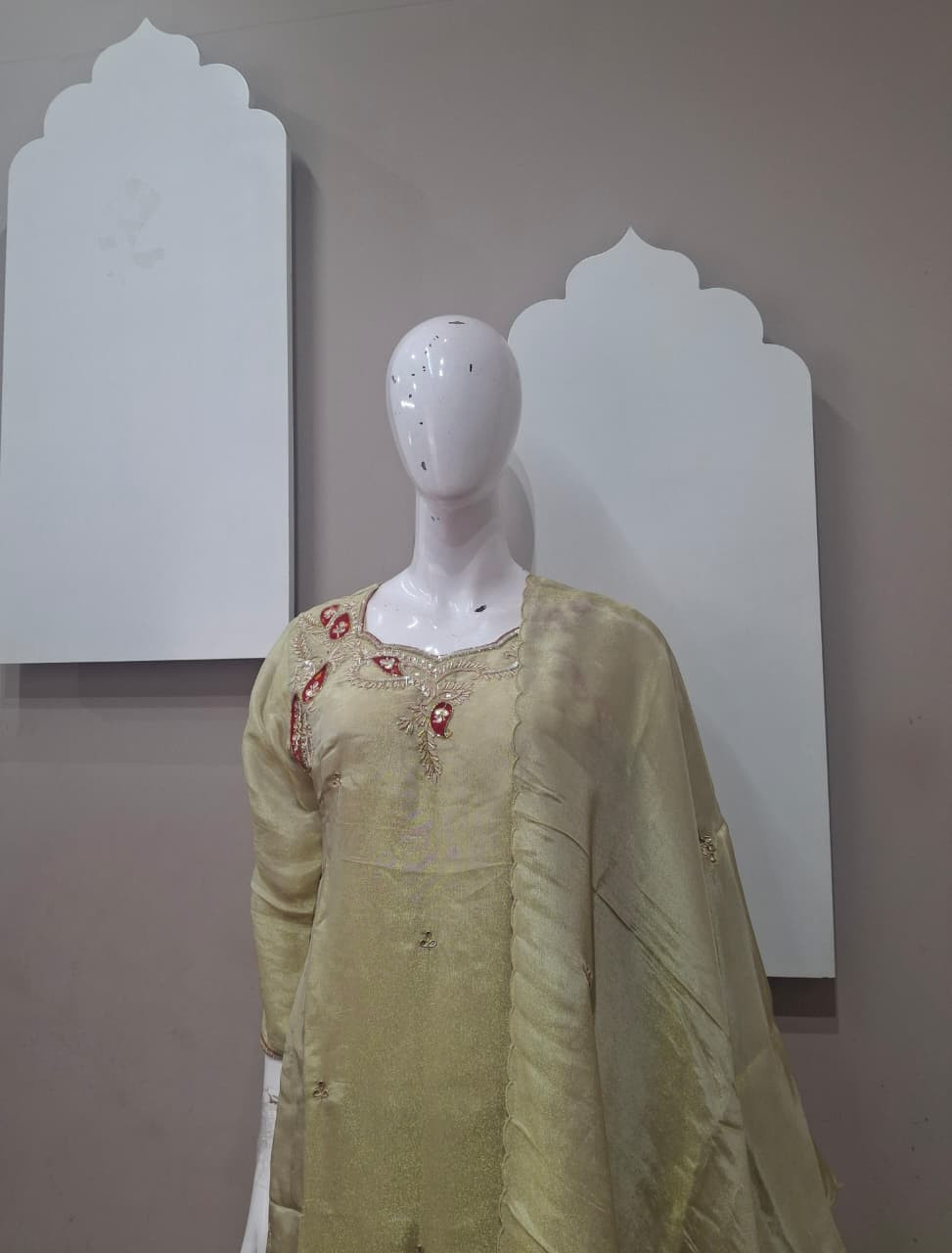 Beautiful suit set in rich tissue fabric featuring elegant handwork with detailed patchwork. A perfect choice for a graceful and festive look.