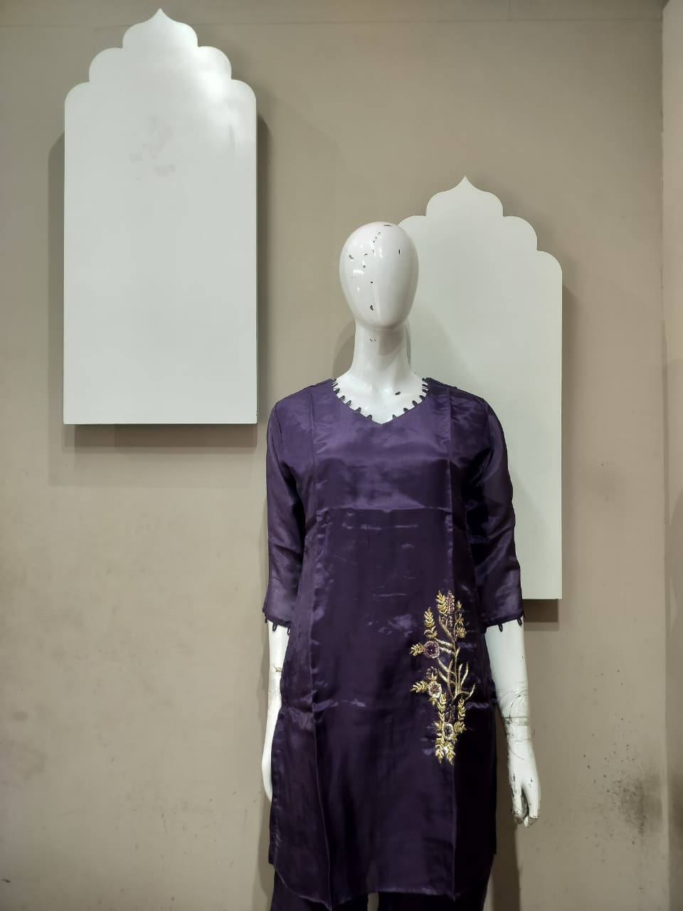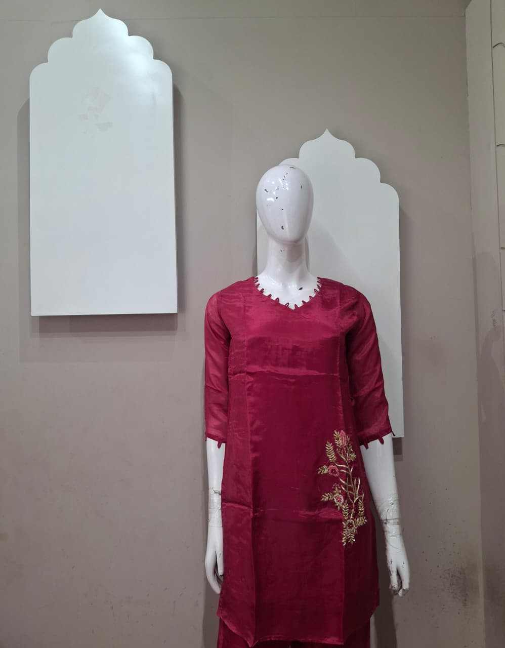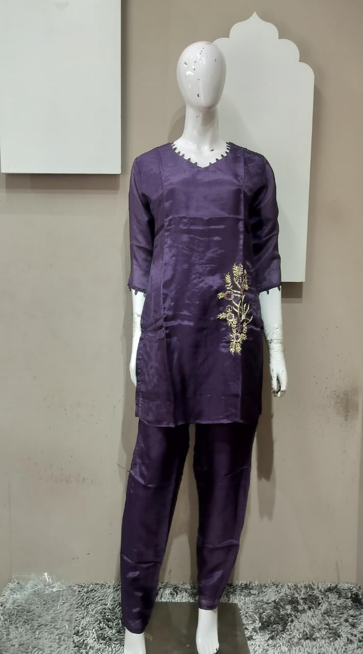 Stylish co-ord set in rich H.O. silk featuring elegant handwork detailing. Perfect for a smart, classy, and effortless festive look.