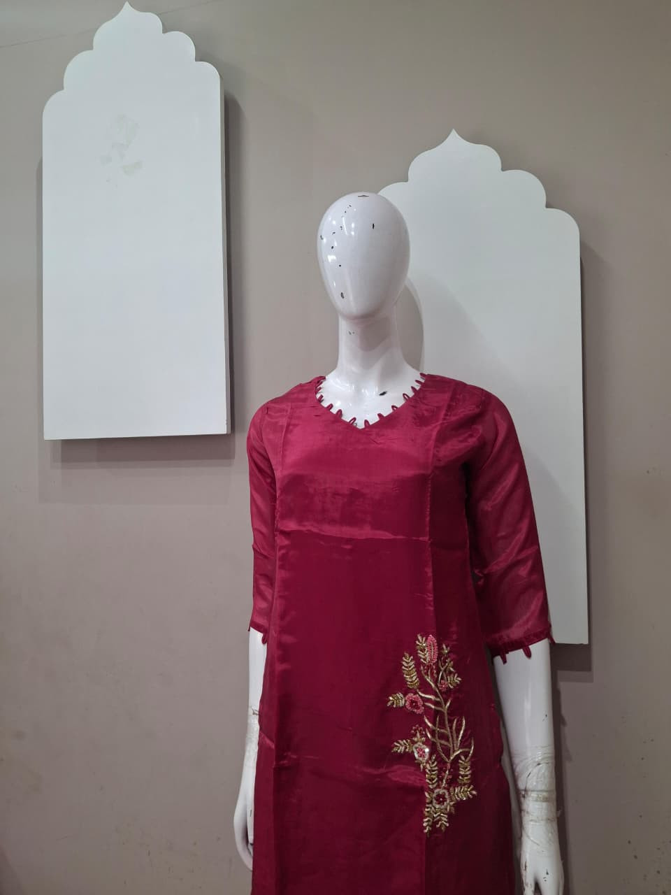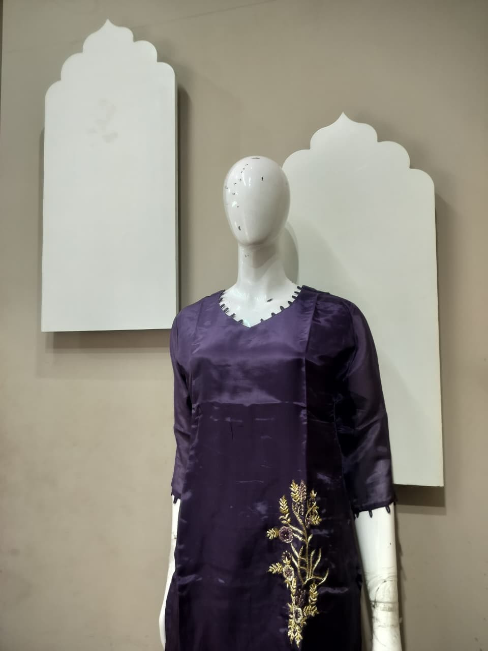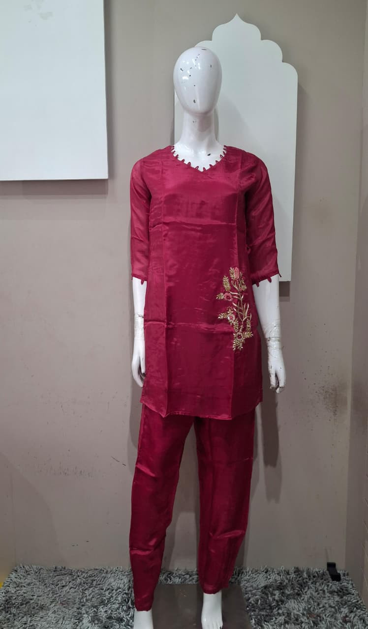 Stylish co-ord set in rich H.O. silk featuring elegant handwork detailing. Perfect for a smart, classy, and effortless festive look.