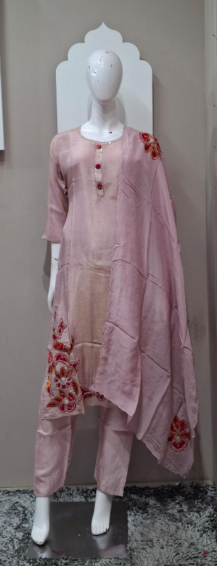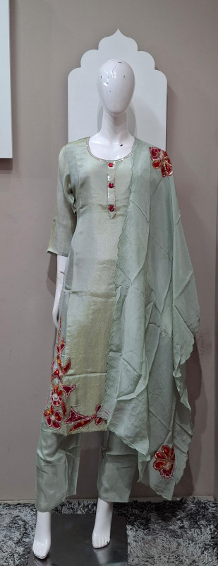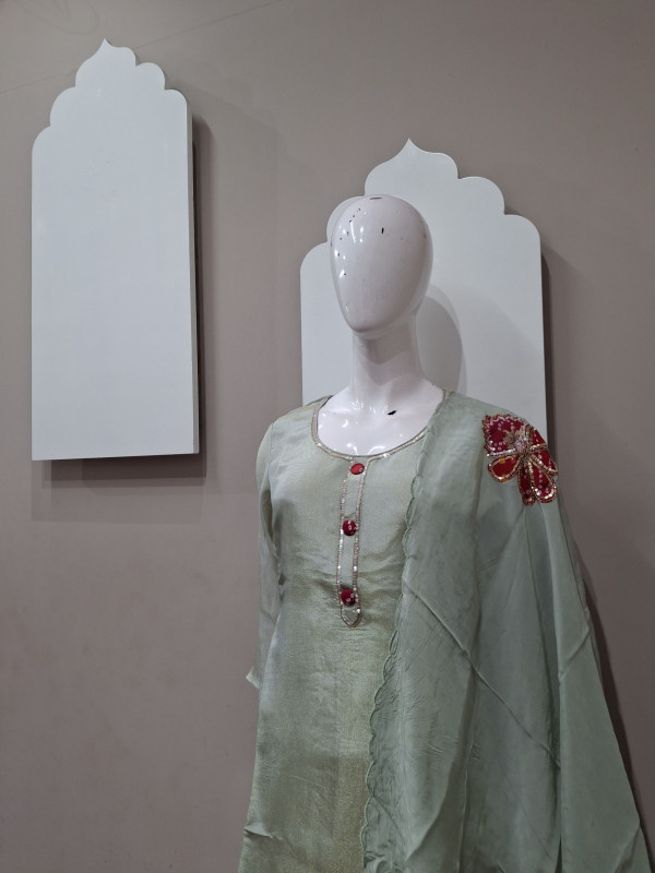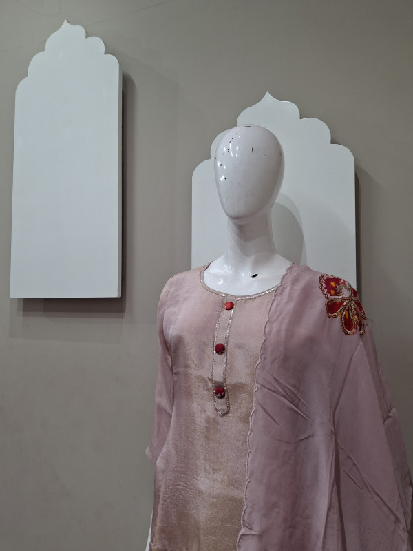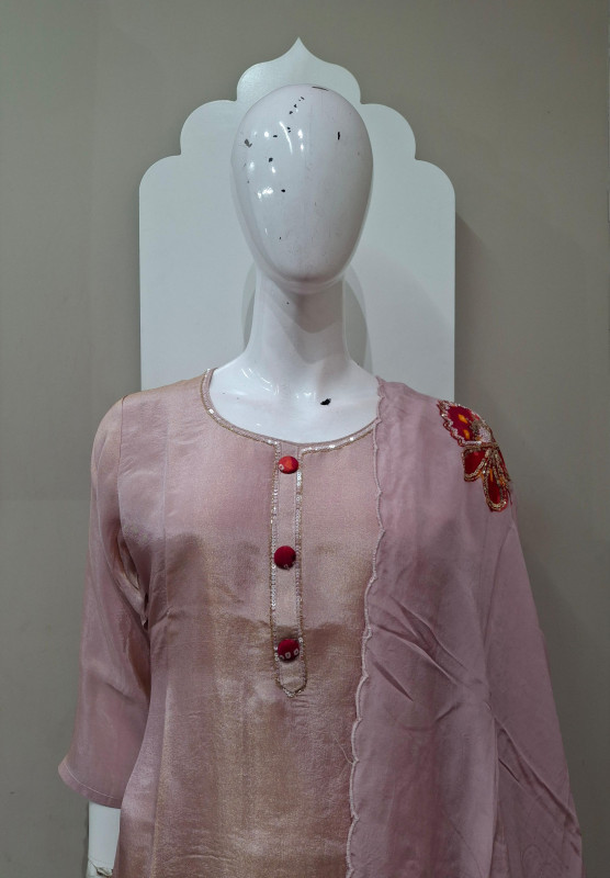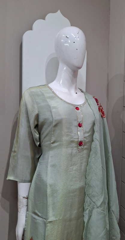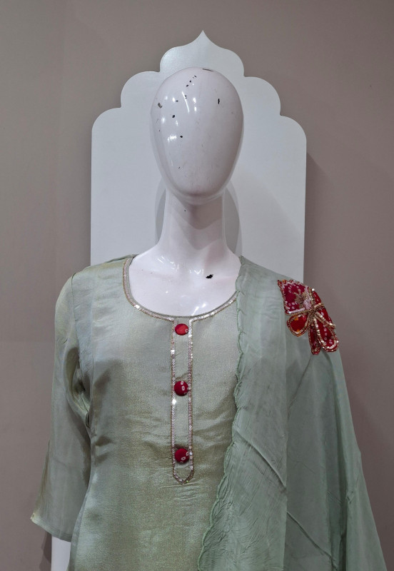 ELEGANT TISSUE FABRIC KURTA FEATURING HANDWORK AND  BHANDHNI PATCHWORK .PAIRED WITH MATCHING PANT AND DUPPATA .PERFACT FOR FESTIVE AND SEMIPARTIES.