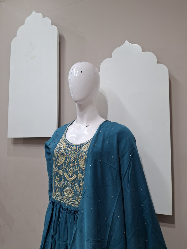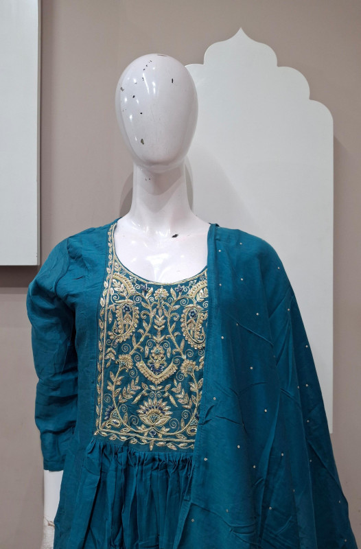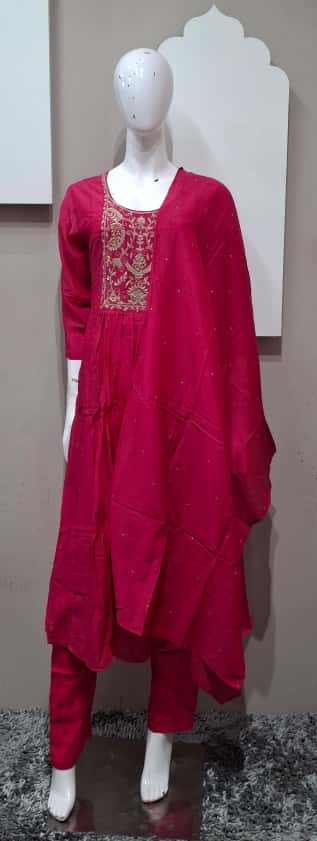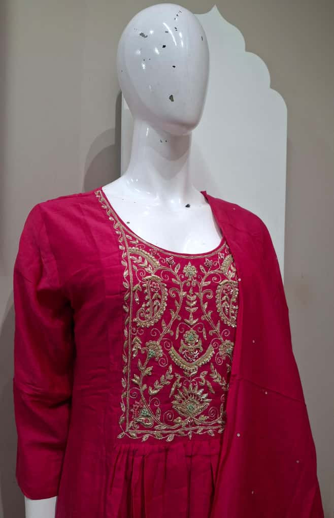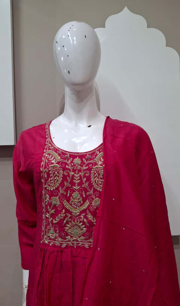 MAL CHANDHERI FABRIC WITH ELEGANT HANDWORK DETAILING ,PAIRED IN TWO TONES RANI PINK AND PEACOCK BLUE.
