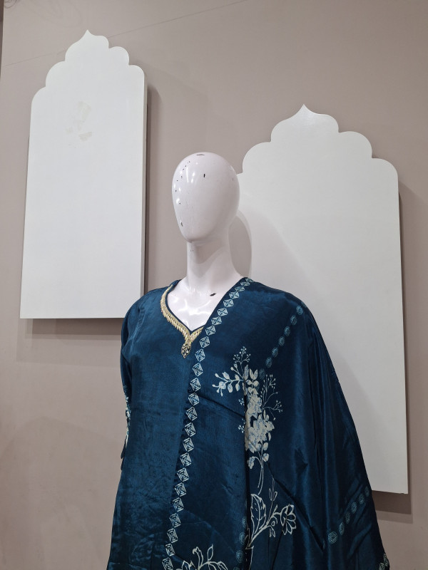 Natural Crepe Kurta Set with digital prints and delicate handwork, paired with a flowy dupatta and comfortable santoon pant. Available in Rust, Rani, Purple & Peacock Blue.