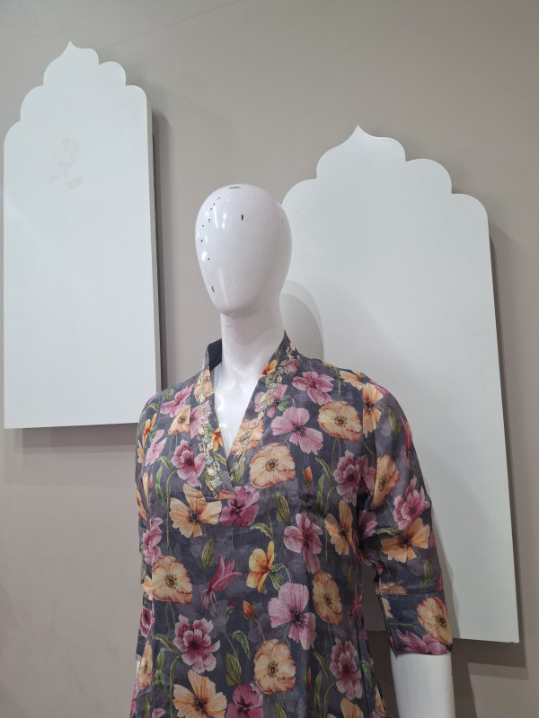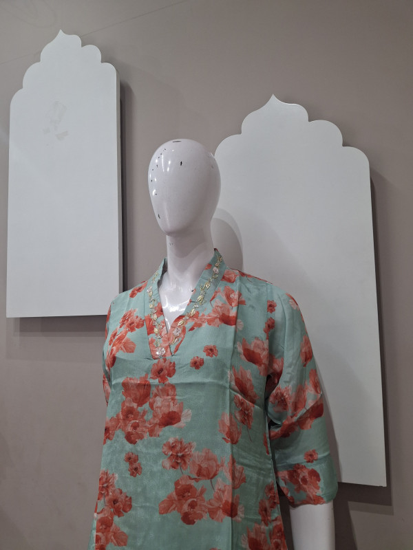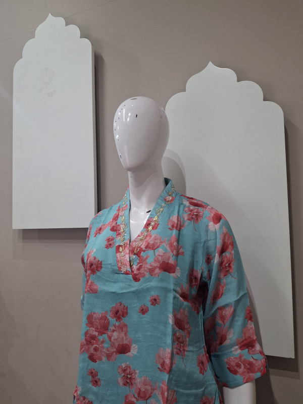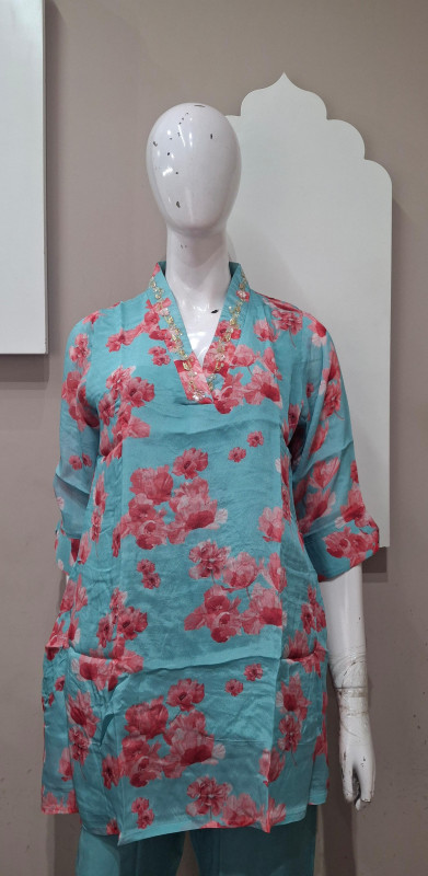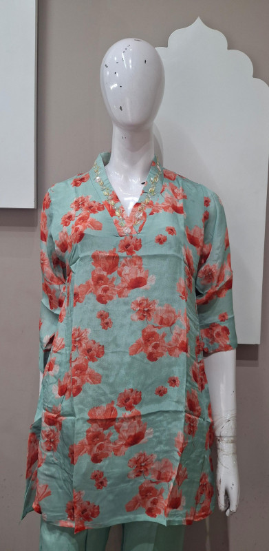 Chinon fabric co-ord set with soft digital floral print. Light, comfortable, and perfect for everyday wear and casual outings.