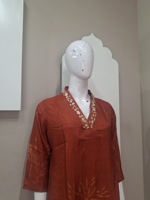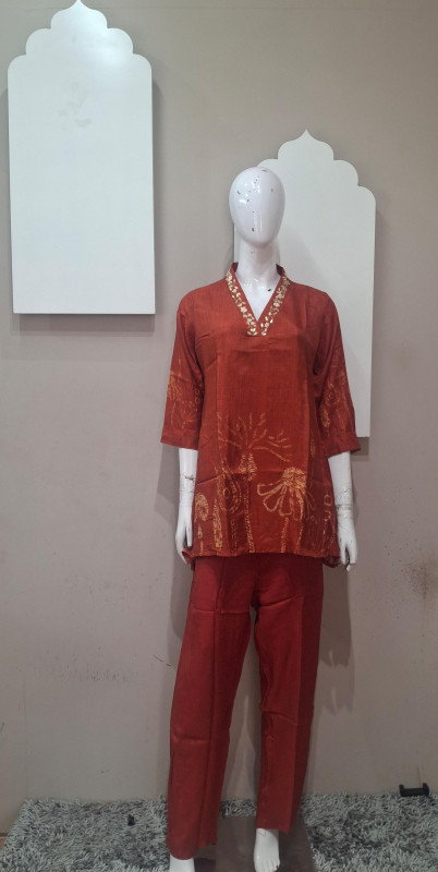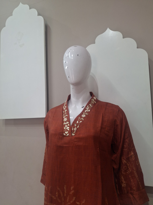 Elegant kurta in premium Ruusain silk featuring subtle digital prints and delicate handwork on the neckline, paired with comfortable santoon pants. Perfect for a graceful and effortless festive look.