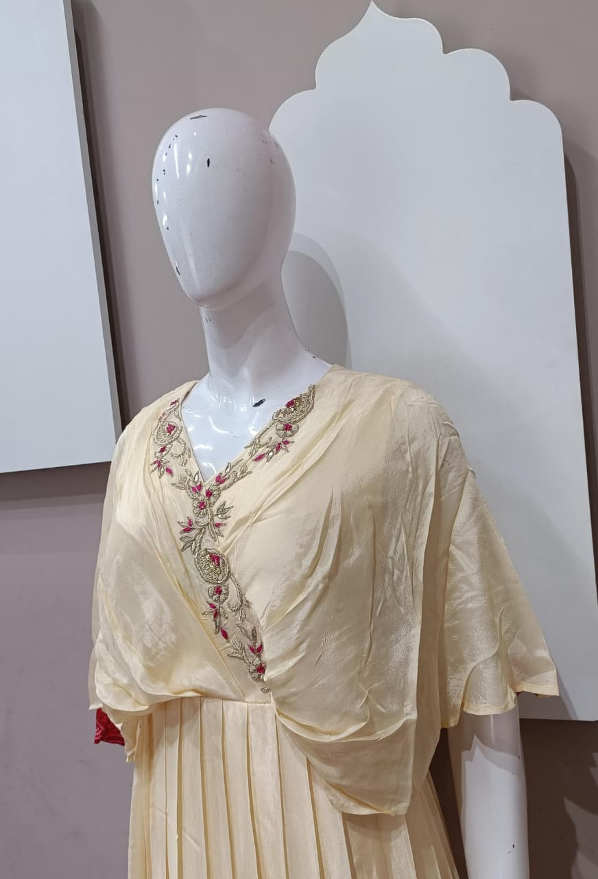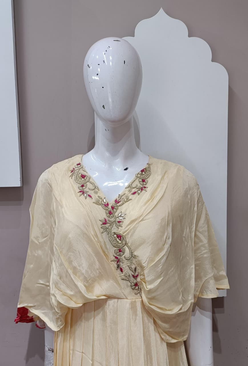 Elegant H.O silk fabric gown with soft floral pattern. Features subtle handwork detailing and a graceful flowy look. Lightweight, comfortable, and perfect for festive occasions, parties, and special gatherings. ✨