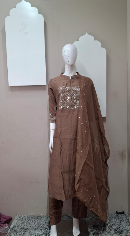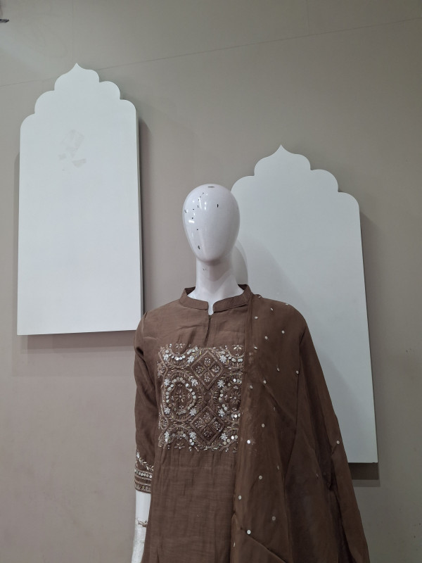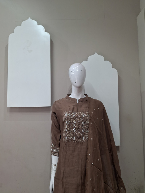 Elegant Malchandheri fabric kurta set with intricate handwork on the yoke, paired with matching pants and a soft embellished dupatta—perfect for graceful everyday and festive wear.