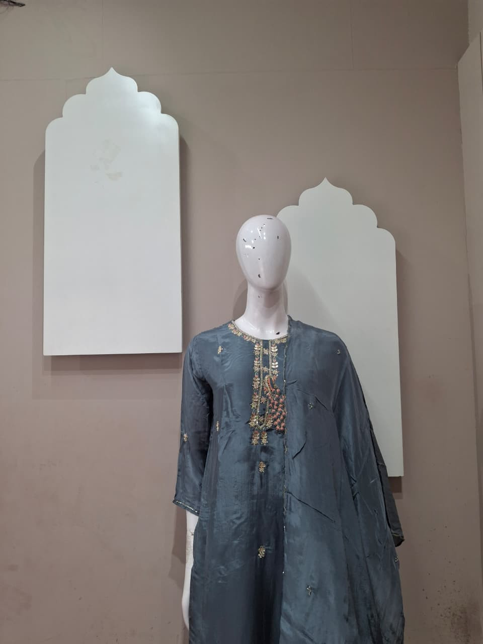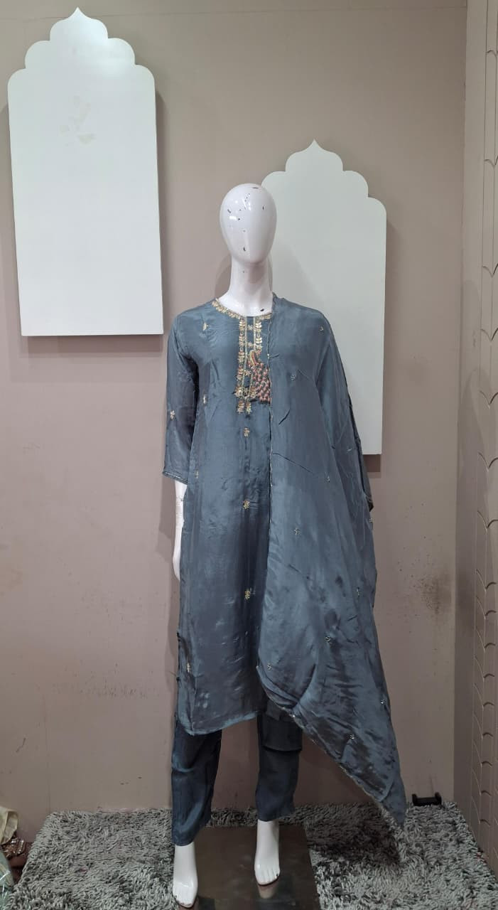Premium H.O. silk kurta paired with matching pants and dupatta, beautifully enhanced with delicate handwork on the neckline. Soft, flowy fabric with a rich finish—perfect for festive wear, small functions, and elegant day looks.