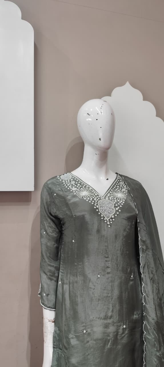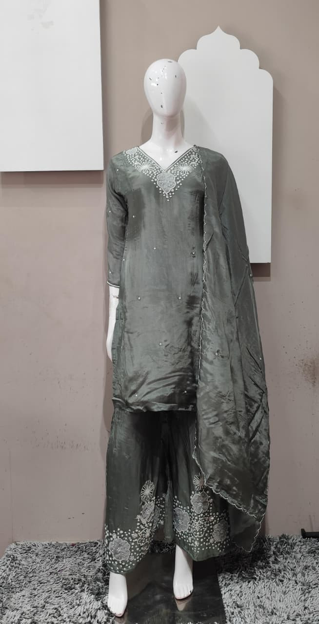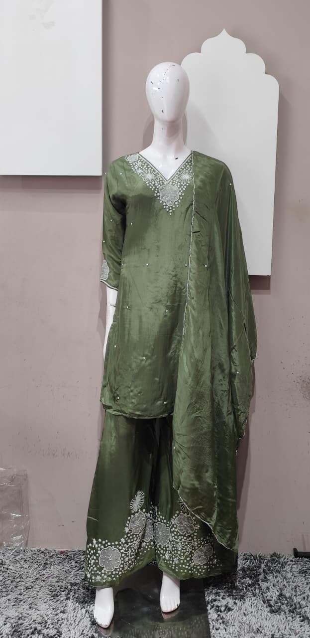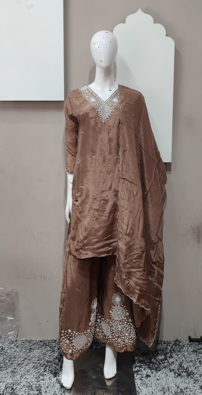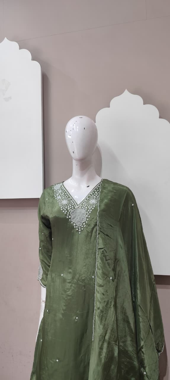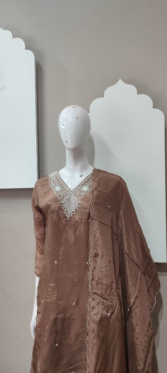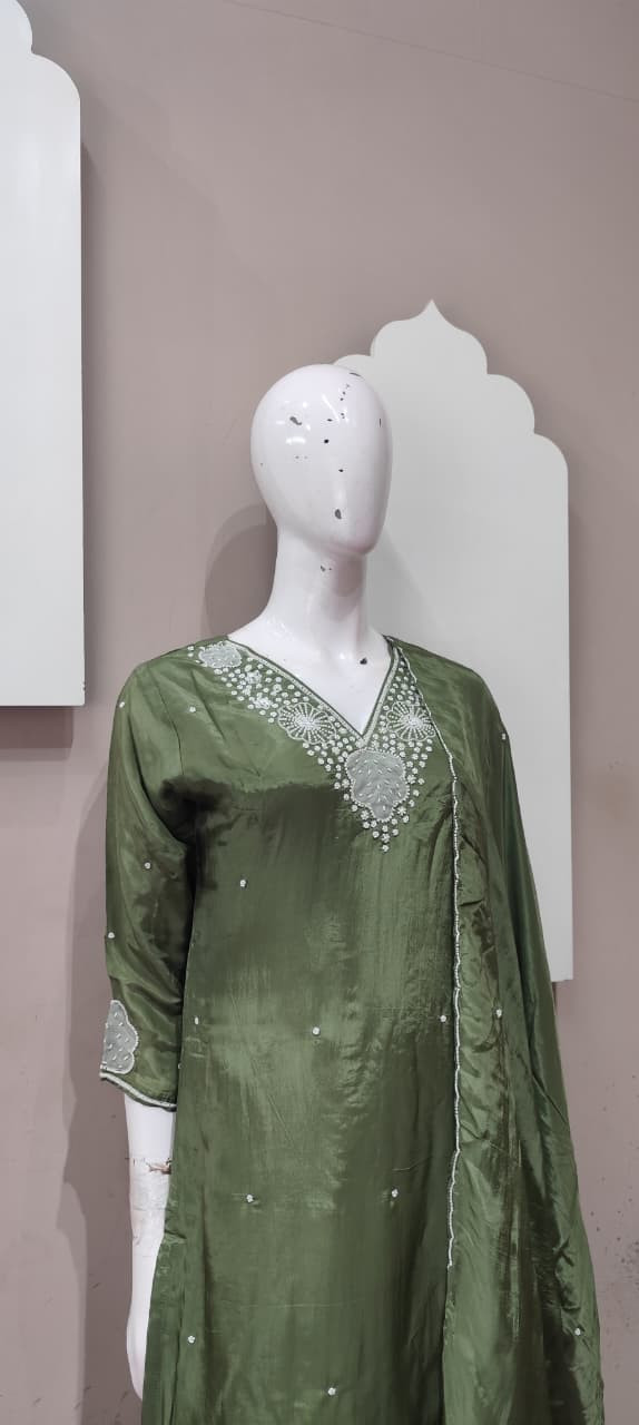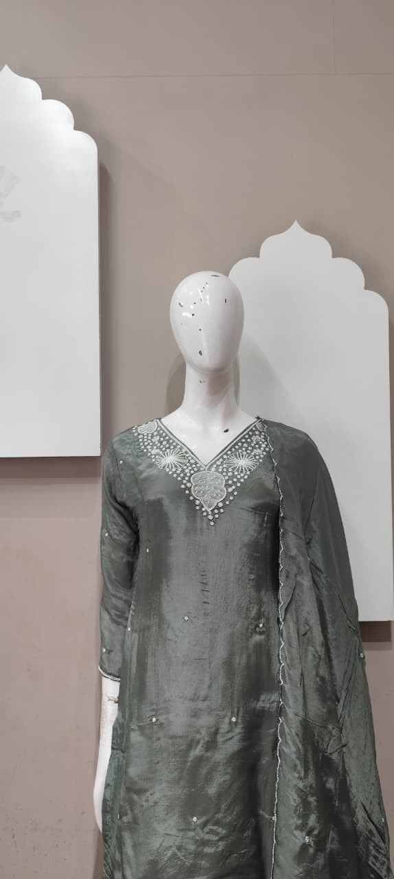 Premium H.O. silk kurta paired with stylish divider pants and a matching dupatta, enhanced with delicate handwork on neckline and hem. Rich texture with a graceful fall—perfect for festive and statement looks.